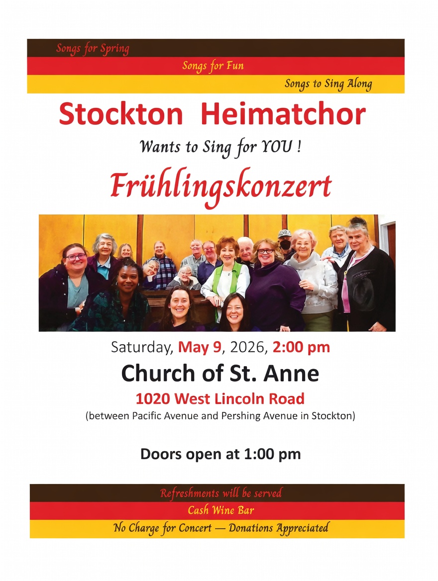 Description: Club members Gabi and Horst Boehm invite everyone to the free Stockton German Choir Spring Concert. Refreshments will be served and there will be a cash wine bar. Donations appreciated.